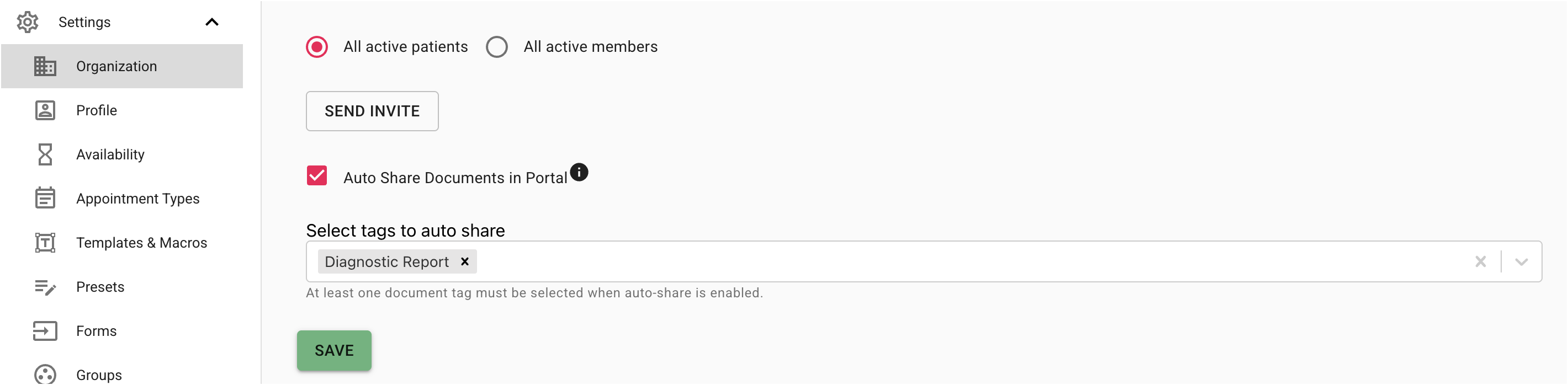 - Under Select tags to auto share, add any document tags you want to automatically share (for example, Diagnostic Report).
