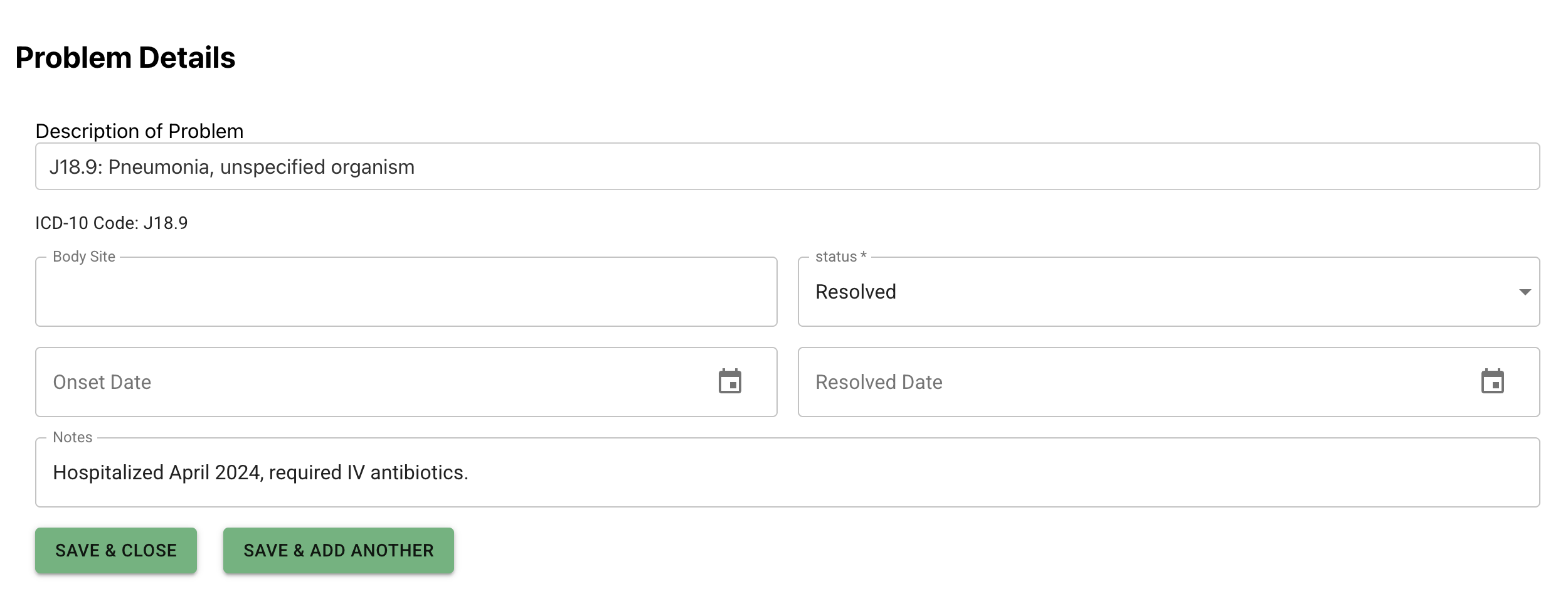 If a patient was hospitalized for pneumonia, you would list the diagnosis (e.g., Pneumonia, ICD-10 J18.9) in the Problem List. In the notes field, you could add context such as “Hospitalized April 2024, required IV antibiotics.”