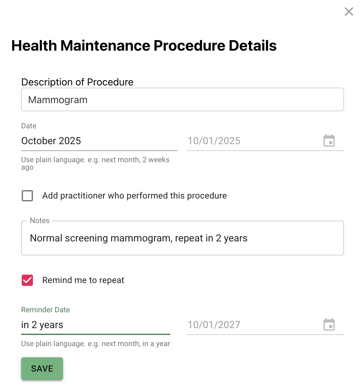 If a patient completed a screening mammogram, you would enter “Mammogram” into Health Maintenance with the date it was completed. You can then set it to repeat in 2 years, which will automatically create a task reminder so you and your team know when the patient is due for their next screening.