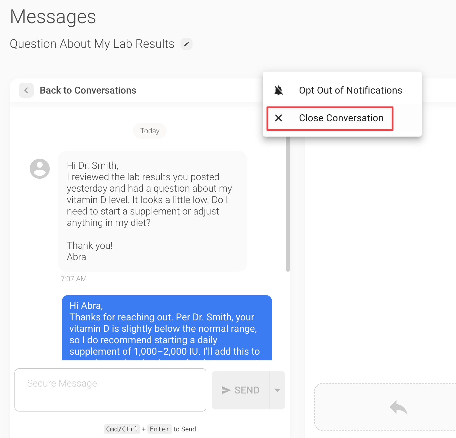 You can now mark a patient message thread as Closed to help keep your inbox organized. Closing a conversation hides it from your main view, but the thread will automatically reopen if the patient replies, ensuring nothing is ever missed.