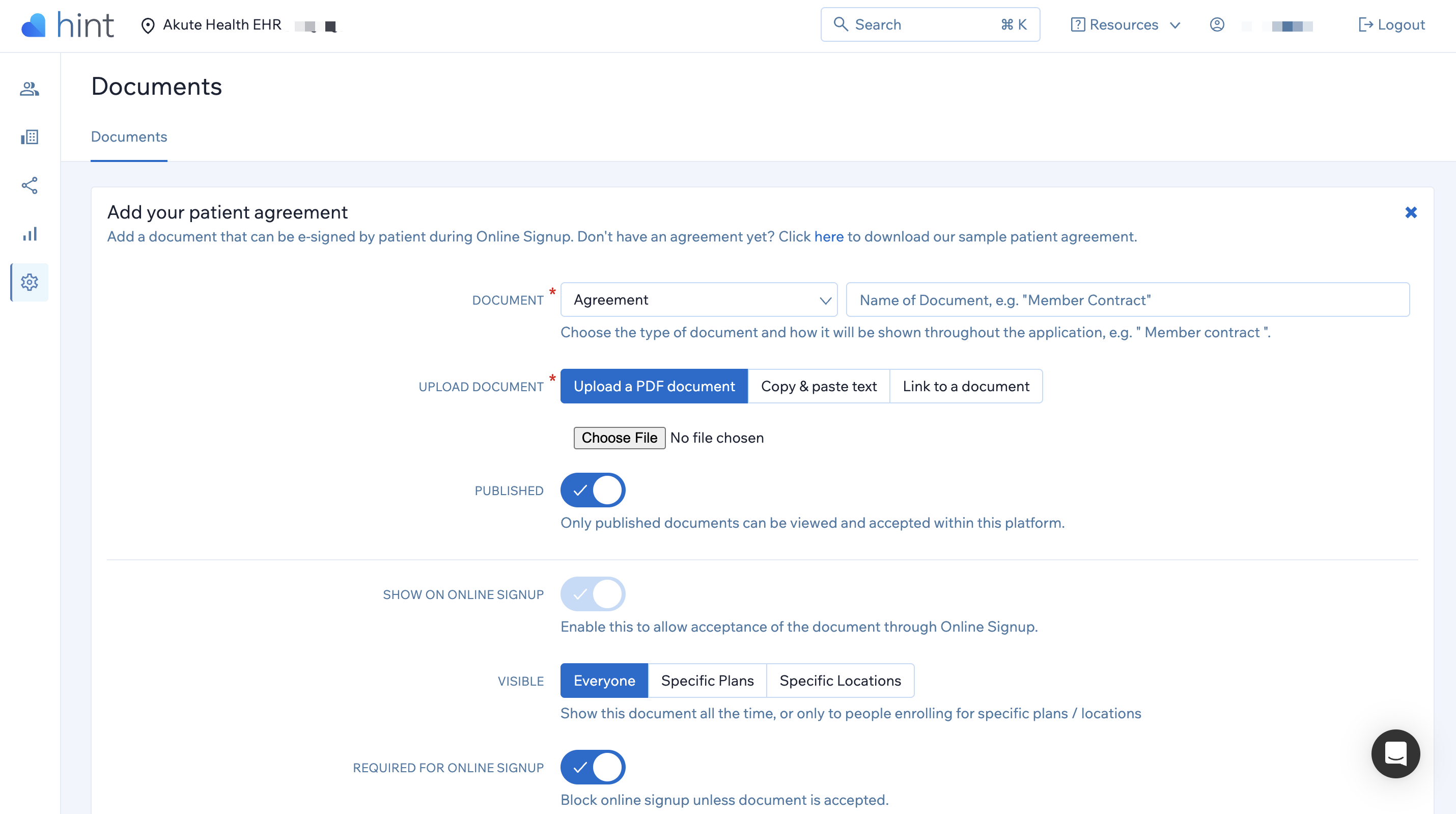 If your practice uses our Hint Integration for membership management, you can create membership agreements, consent forms, and other documents directly in Hint. These documents can be published for patients to review or accept during your online signup flow, depending on your configuration.