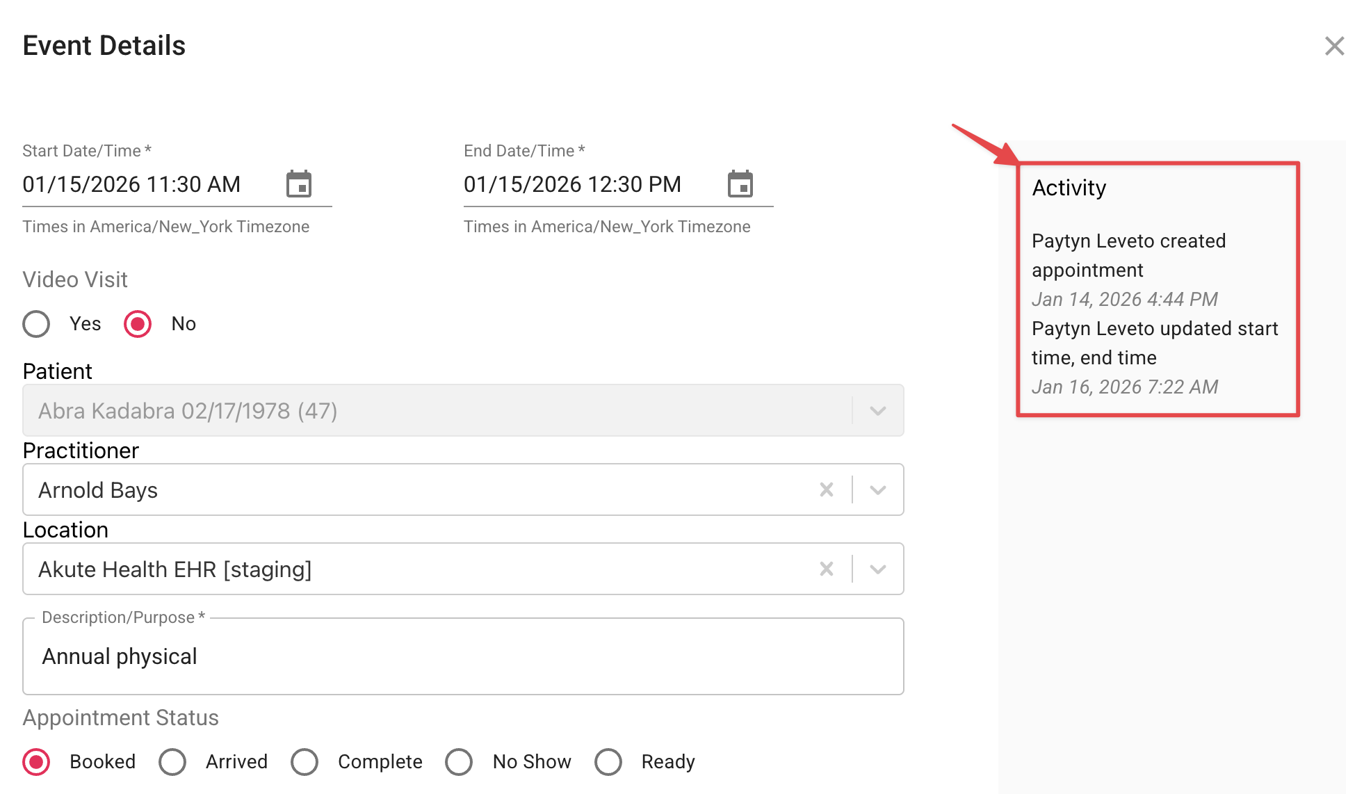 Akute now tracks all appointment activity directly in the UI for better visibility and auditing.