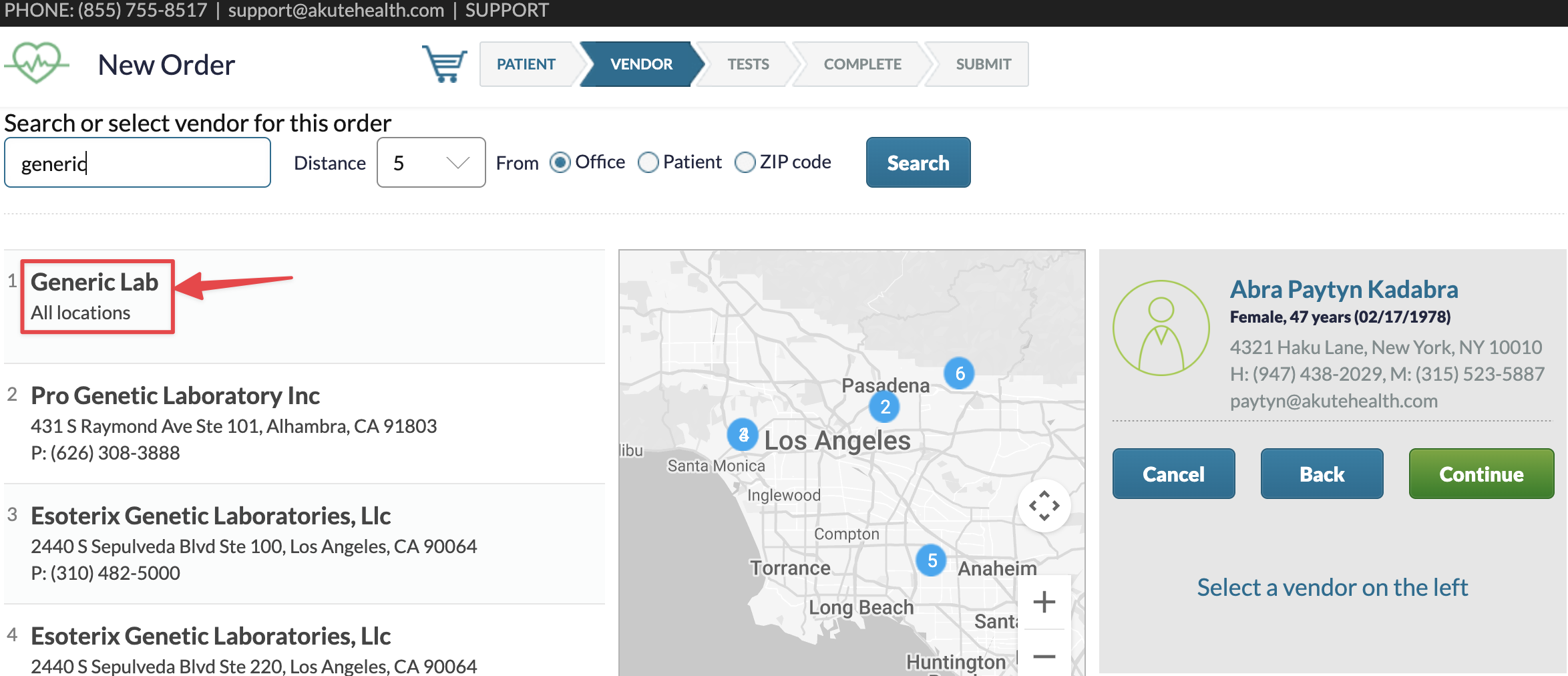 Generic orders are intentionally not tied to a specific facility. Other than selecting the generic vendor and acknowledging patient delivery, the workflow is the same as placing a standard lab or imaging order.
