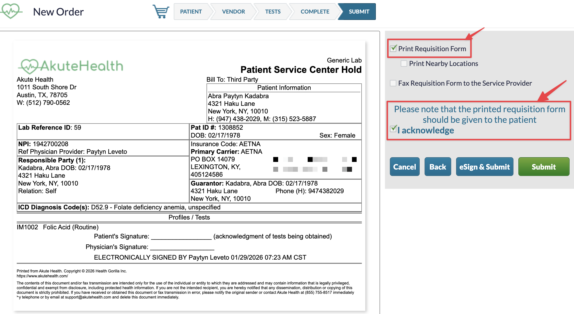 Submit the order once the acknowledgment is checked.