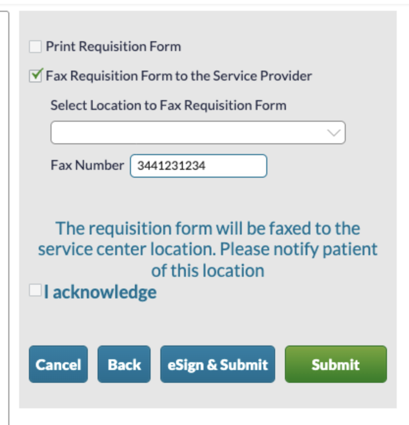Complete the order as usual. On the final step, you will be given options for how the requisition is delivered. You may provide the requisition directly to the patient as a PDF, or you may manually fax the requisition by entering a fax number for a service provider that is not yet added as a vendor